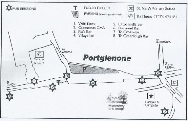 Map of Portglenone showing the pubs and venues for sessions and also areas for Caravans and Camping with contact details for Kathleen to book caravan spaces at the Marina.