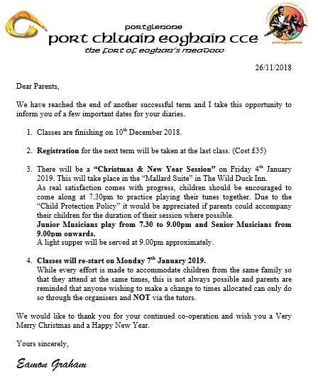 As real satisfaction comes with progress, children should be encouraged to come along at 7.30pm to practice playing their tunes together. Due to the "Child Protection Policy” it would be appreciated if parents could accompany their children for the duration of their session where possible.