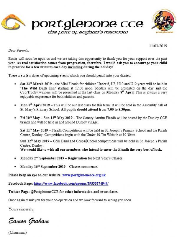 Sat 11th May 2019 – Fleadh Competitions will be held in St. Joseph’s Primary School and the Parish Centre, Dunloy. Competitions begin with the Under 10 Tin Whistle at 10.30am.