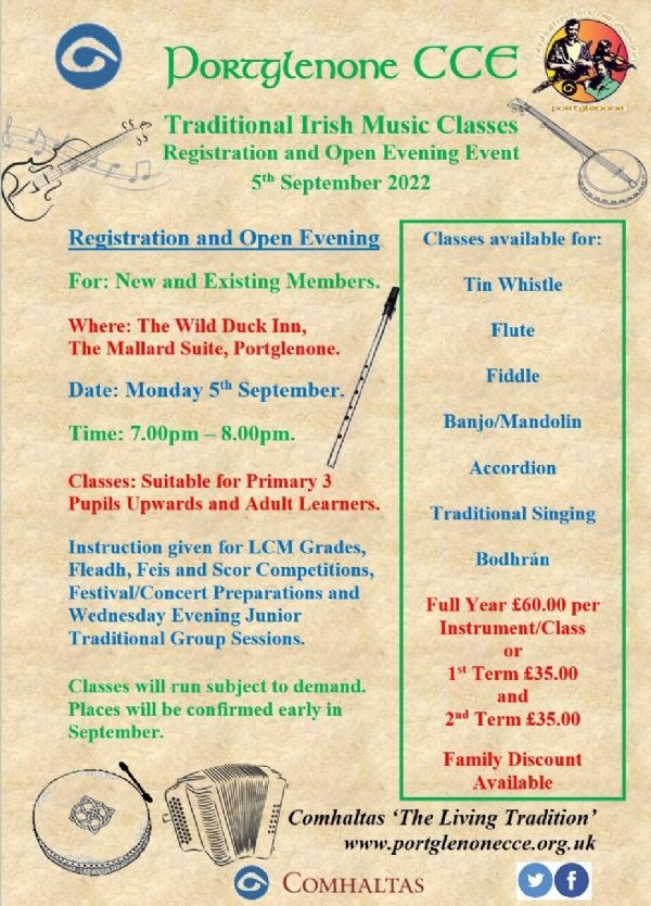 Portglenone CCE Registration and Classes for 2022-2023