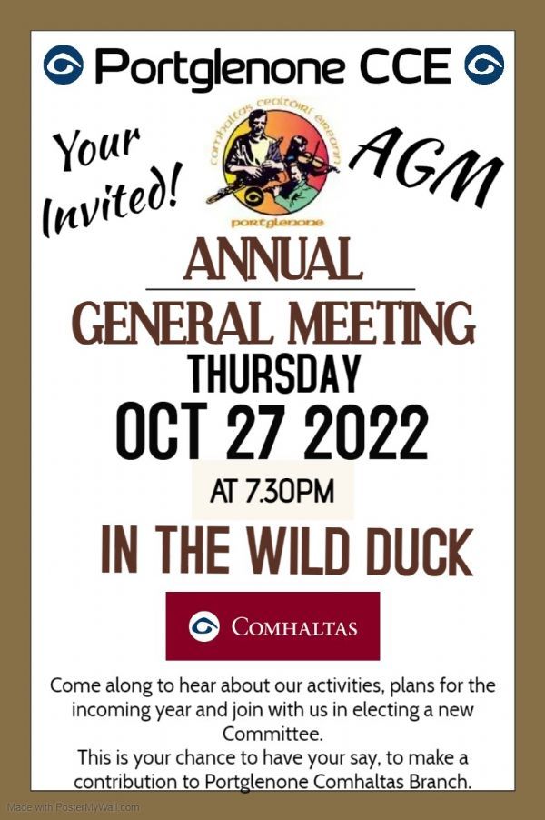 The Portglenone CCE Annual General Meeting is next Thursday 27th October in The Wild Duck Inn @ 7.30pm so why not come along to hear about our Branch activities, our plans for the incoming year and help elect the new committee for 2022-2023.
