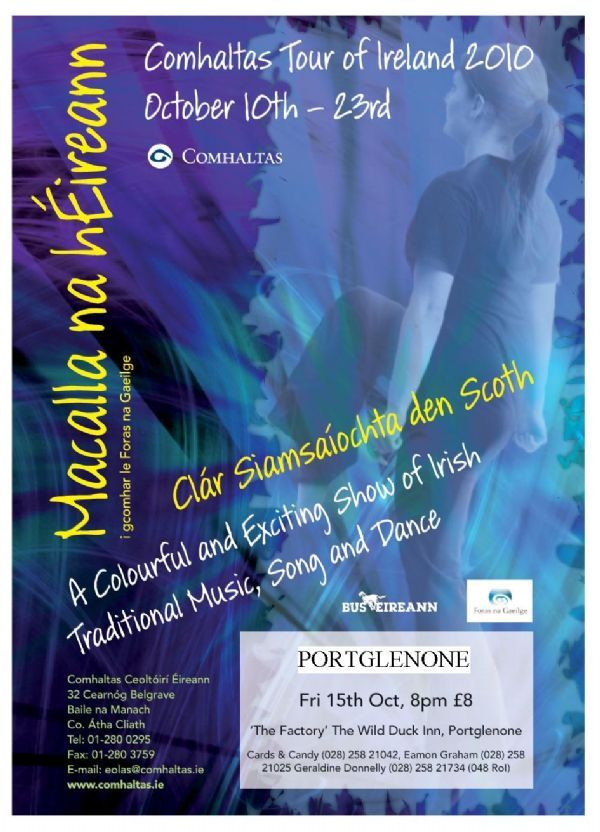 The Portglenone CCE Branch welcomes Macalla na hÉireann, the 2010 Comhaltas Tour of Ireland to County Antrim on Friday 15th October. Concert venue is ‘The Factory' in The Wild Duck.