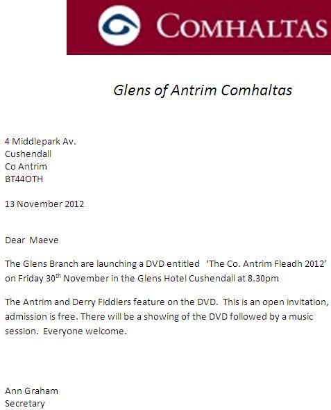 The Glens Branch are launching a DVD entitled ‘The Co. Antrim Fleadh 2012’ on Friday 30th November in the Glens Hotel Cushendall at 8.30pm