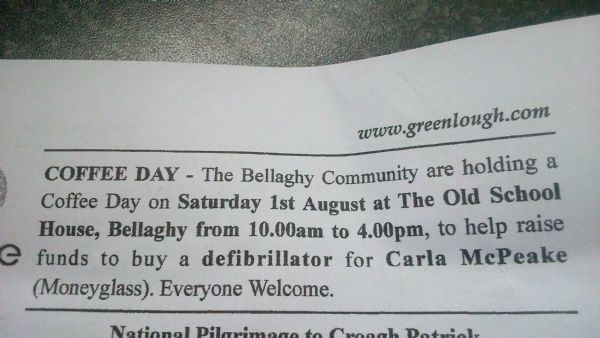 Coffee Day 10.00am to 4.00pm on Sat 1st August at The Old School House, Bellaghy, to help raise funds to buy a defibrillator for Carla McPeake.