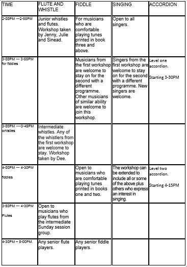 Comhaltas Ghlinntí Aontroma have organised workshops in Cushendall in the following instruments, flute, fiddle, accordion and singing for Saturday 14th April.