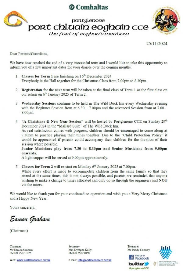 Please see the dates for the Christmas Session, the final class before Christmas, registrations for the new term and other important dates over the Christmas Season.